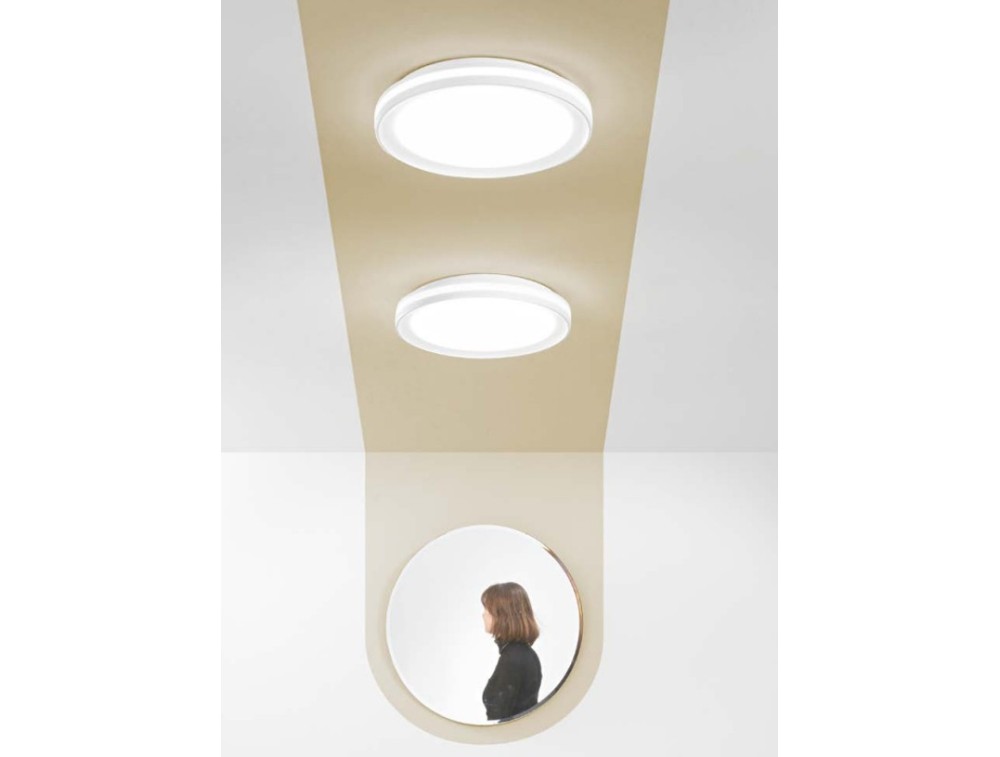 La plafoniera Makeup è realizzata in acrilico bianco ed ha una forma circolare. Questa soluzione offre due fasci di luce, e quello esterno presenta la modalità RGB per un tocco di colore dinamico. La temperatura regolabile consente la creazione dell'atmosfera ideale in ogni momento