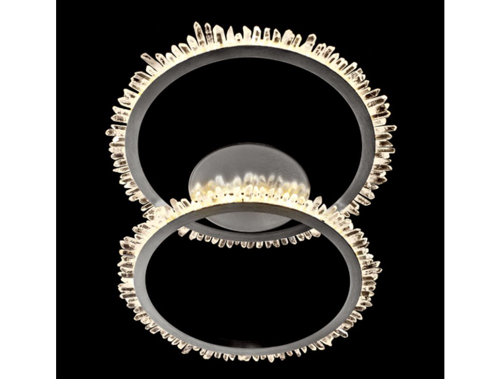 Lampada da parete o soffitto composta da cristalli di quarzo fissati in due cerchi di metallo di finitura satinata. Ideale per arredare e illuminare cucina, salotto, camera da letto e corridoio. Disponibile color oro satinato o nichel satinato.