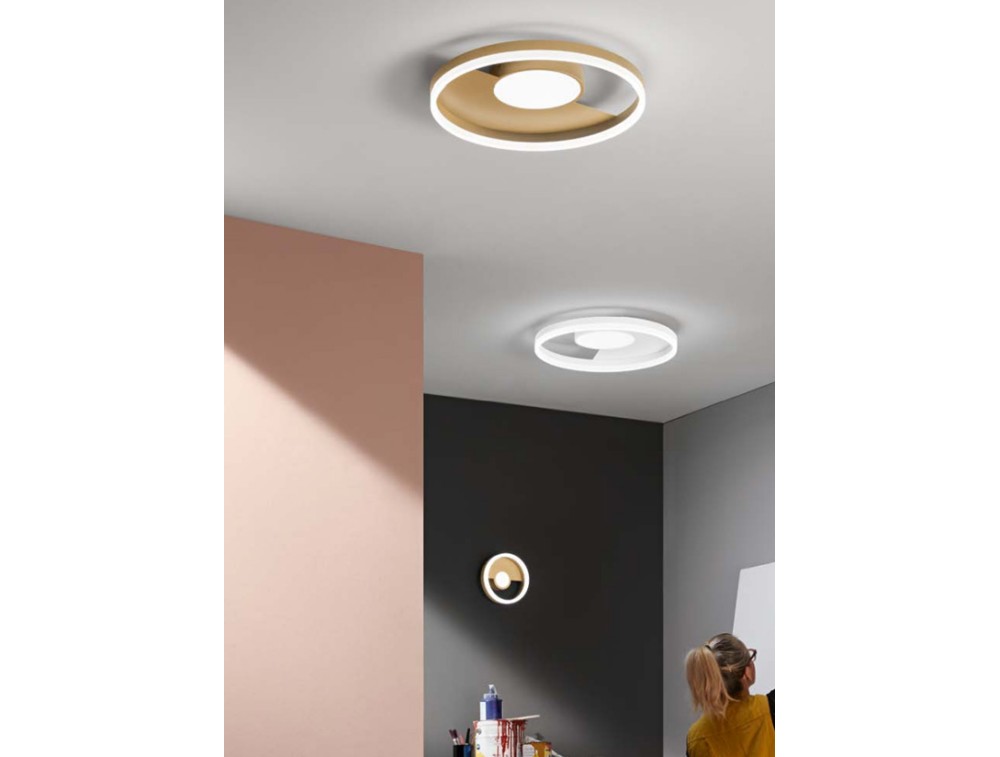 Collezione con struttura in metallo disponibile nella versione bianca o oro con punto luce centrale e diffusore perimetrale in acrilico. Sistema cambio colore temperatura con interruttore. Perfetta cucina, salotto, camera da letto e corridoio