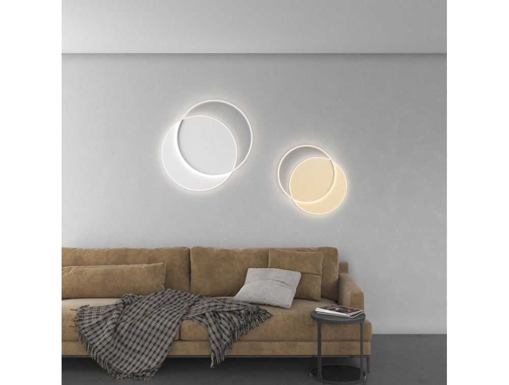 Applique/Plafoniera con struttura interna ed esterna in metallo. Le due strutture tonde parzialmente sovrapposte creano un effetto luminoso molto suggestivo e moderno. Dotata di switch che consente di selezionare la temperatura di colore della luce tra 3000°K e 4000°K in fase di installazione.