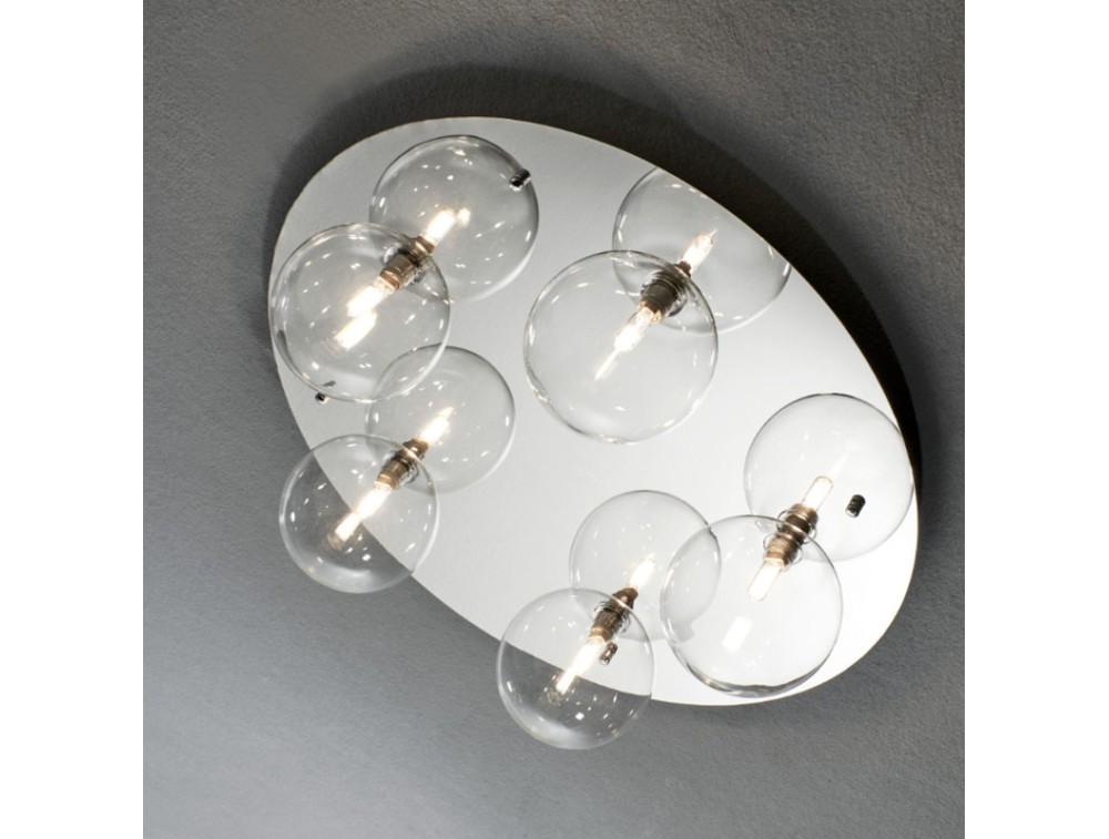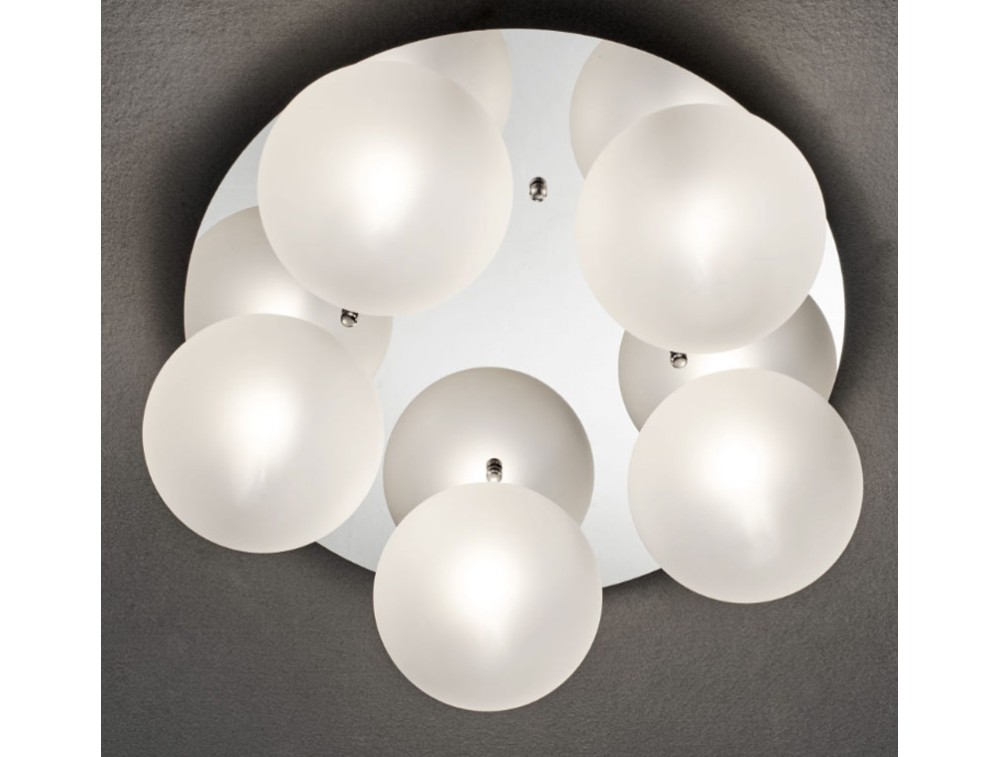 Plafoniera con montatura in metallo nei colori bianco, nero, oro satinato e cromo. Diffusori a forma di sfera con diametro 14cm in vetro disponibile ambra, fumee, trasparente e satinato. Disponibili anche sfere con diametro di 22cm su richiesta. Ideale per ingressi o corridoi, dove lo spazio in altezza è limitato ma serve un tocco di stile. Soggiorni moderni, dove si sposa bene con arredamenti minimalisti, superfici laccate o dettagli in metallo e camere da letto, dove la luce soffusa dei globi opachi crea un'atmosfera rilassante.