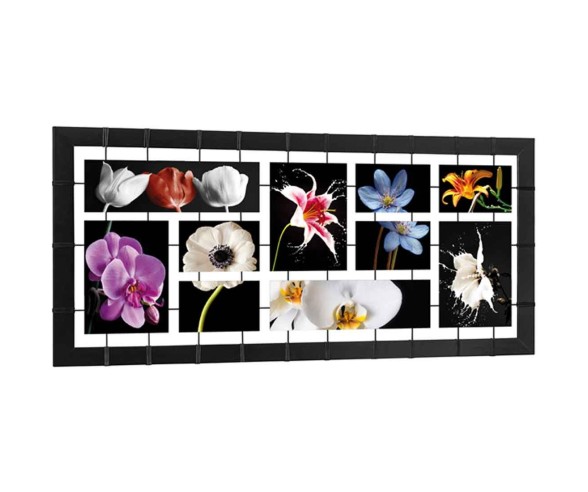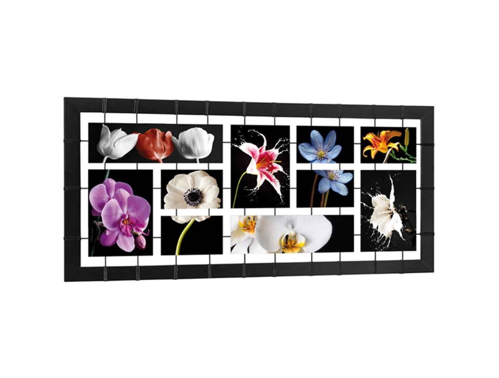 Grande quadro moderno da parete della collezione Bouquet del produttore Made in Italy Pintdecor, con cornice in legno laccata colore nero e formato da 10 pannelli in MDF tenuti sospesi da corde.