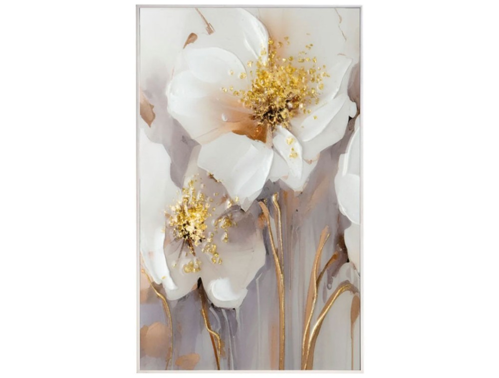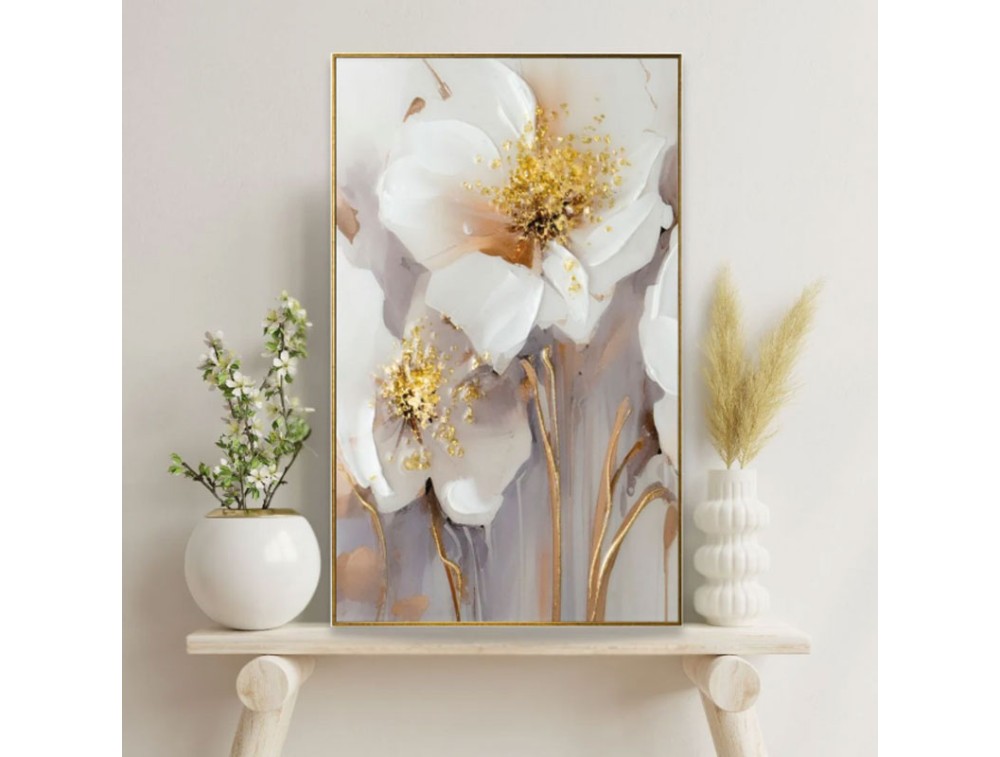 Quadro con soggetto floreale, immagine realizzata con stampa su carta polimerica di alta qualità applicata su pannello in mdf ad alta intensità. Ogni quadro viene interamente decorato a mano con resine lucide, cristalli e pietre colorate, pennellate tono su tono e applicazione di paste materiche per donare rilievo all'articolo. La cornice bianca, oro e argento da scegliere, è inclusa. Ideale per cucina, salotto e camera da letto.