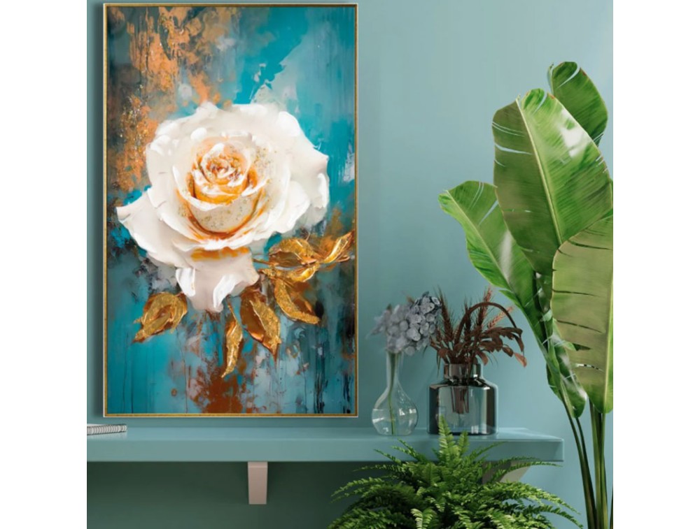 Quadro con soggetto floreale, immagine realizzata con stampa su carta polimerica di alta qualità applicata su pannello in mdf ad alta intensità. Ogni quadro viene interamente decorato a mano con resine lucide, cristalli e pietre colorate, pennellate tono su tono e applicazione di paste materiche per donare rilievo all'articolo. La cornice da scegliere tra color oro, argento e bianca, è inclusa. Ideale per cucina, salotto e camera da letto.