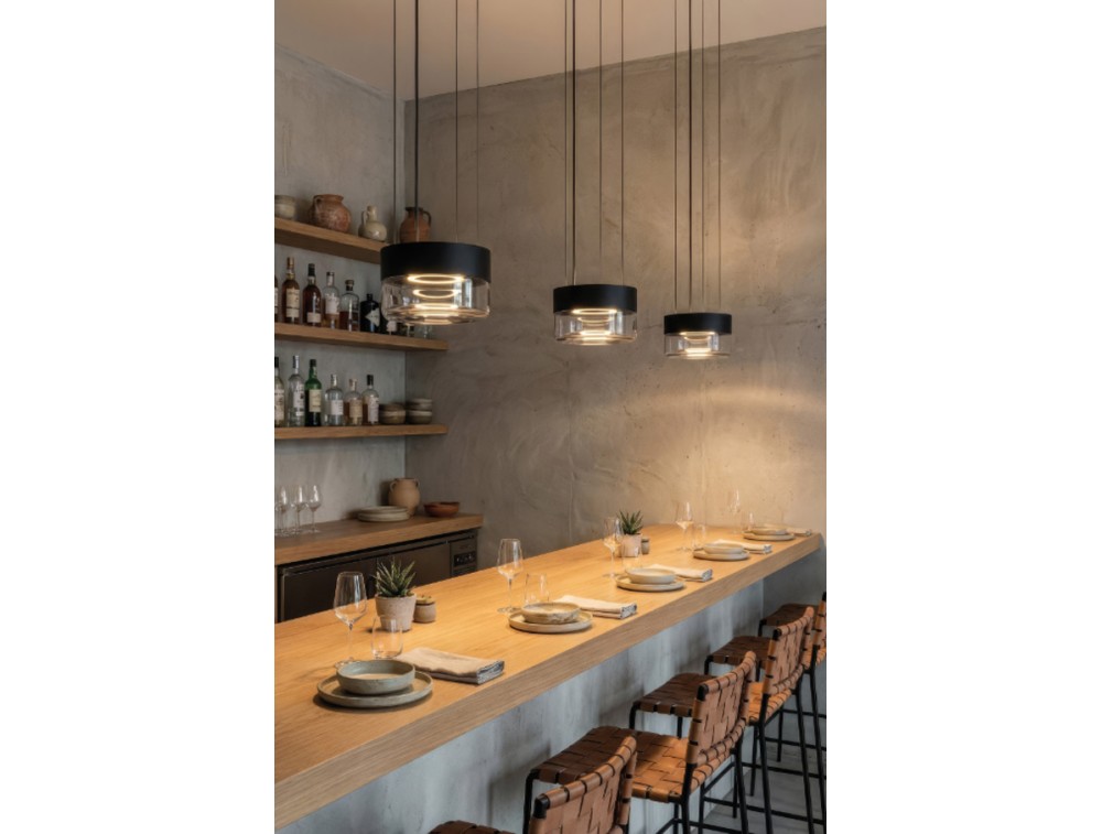Sospensione led realizzata in alluminio con diffusore in vetro. Dotata di protezione IP65 che permette sia all'uso interno che l'uso esterno. Perfetta per cucina, salotto, camera da letto e corridoio. Si distingue per un design scultoreo e ultra-moderno, che gioca con la trasparenza del vetro e la precisione del metallo per creare un effetto luminoso ipnotico. Colori: Nero e fumee.