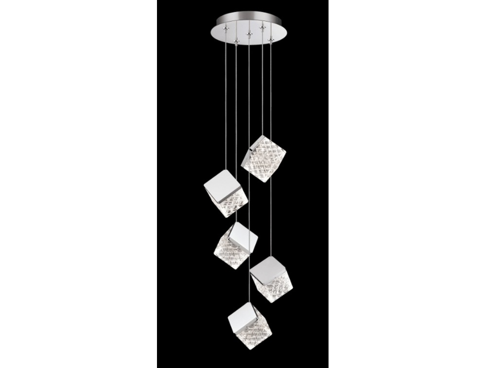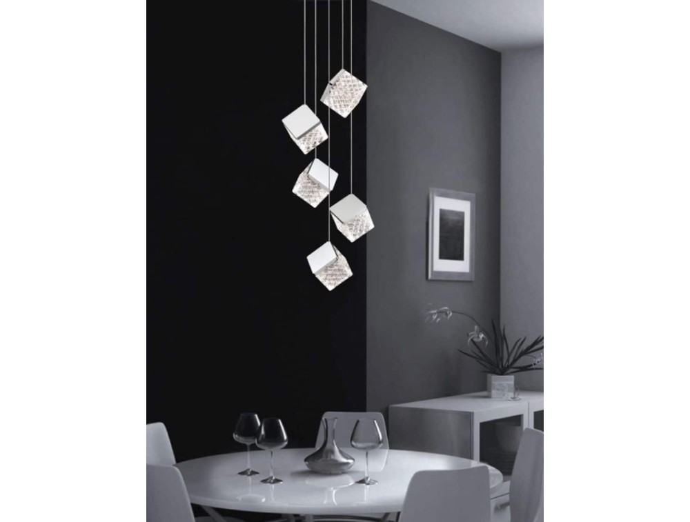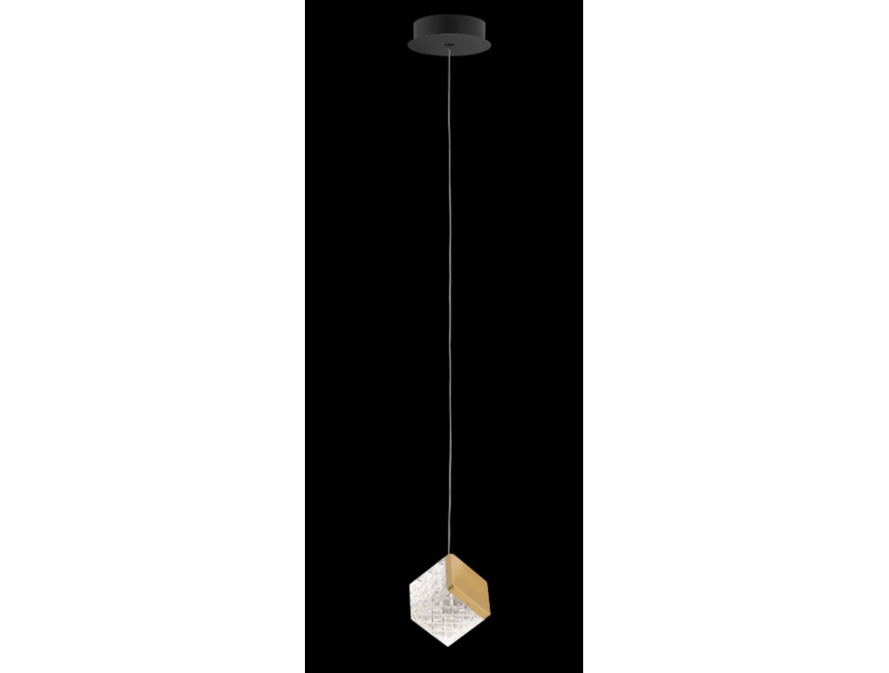 Sospensione con rosone circolare con 1, 3 o 5 lampade con pendente cubico. Disponibile con rosone nero satinato e pendente oro satinato oppure con rosone cromo lucido e pendente cromo lucido. Realizzata in metallo e con diffusore in acrilico. Tecnologia led integrata.