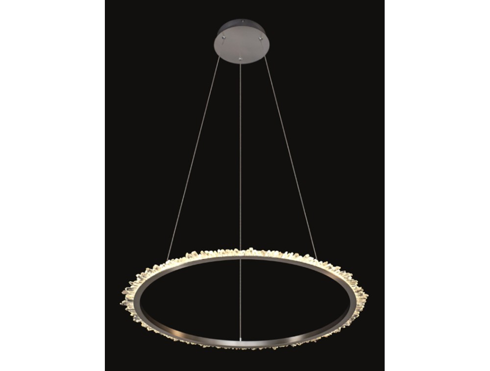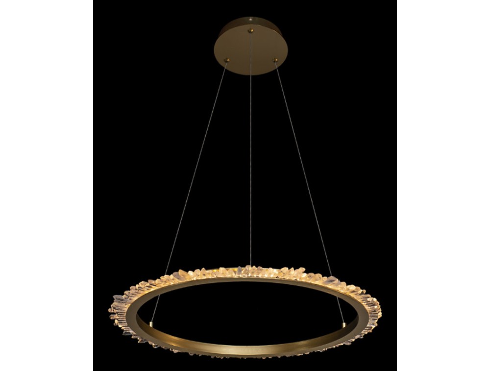 Sospensione composta da cristalli di quarzo fissati in un cerchio di metallo di finitura satinata. Ideale per arredare e illuminare cucina, salotto, camera da letto e corridoio. Disponibile color oro satinato o nichel satinato.