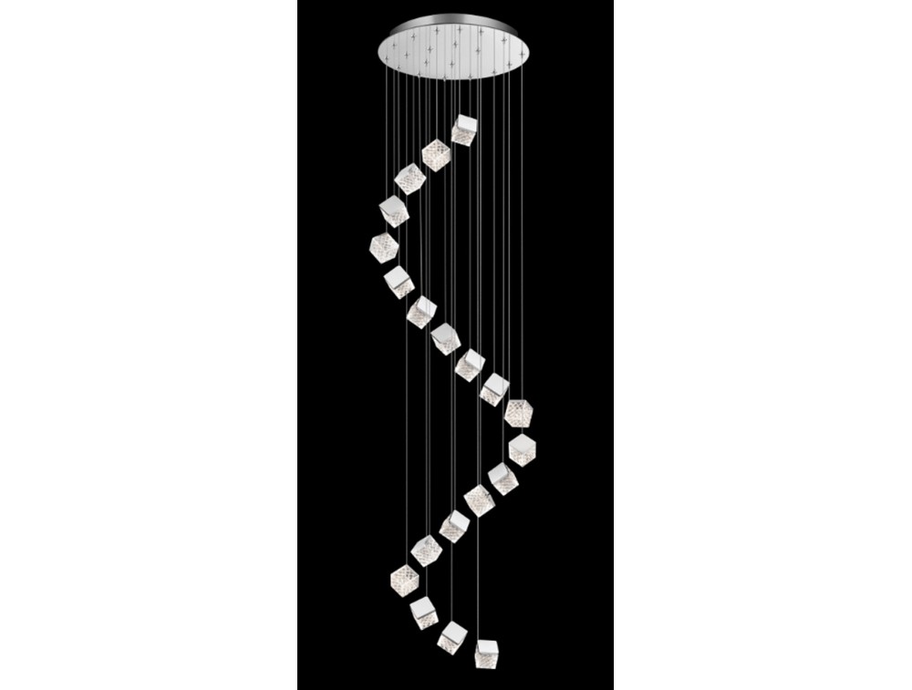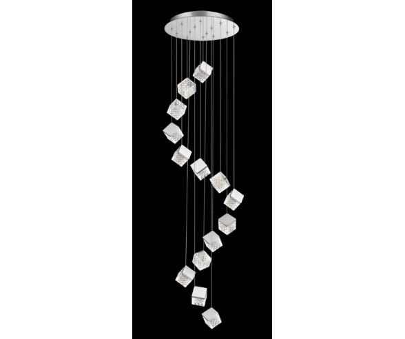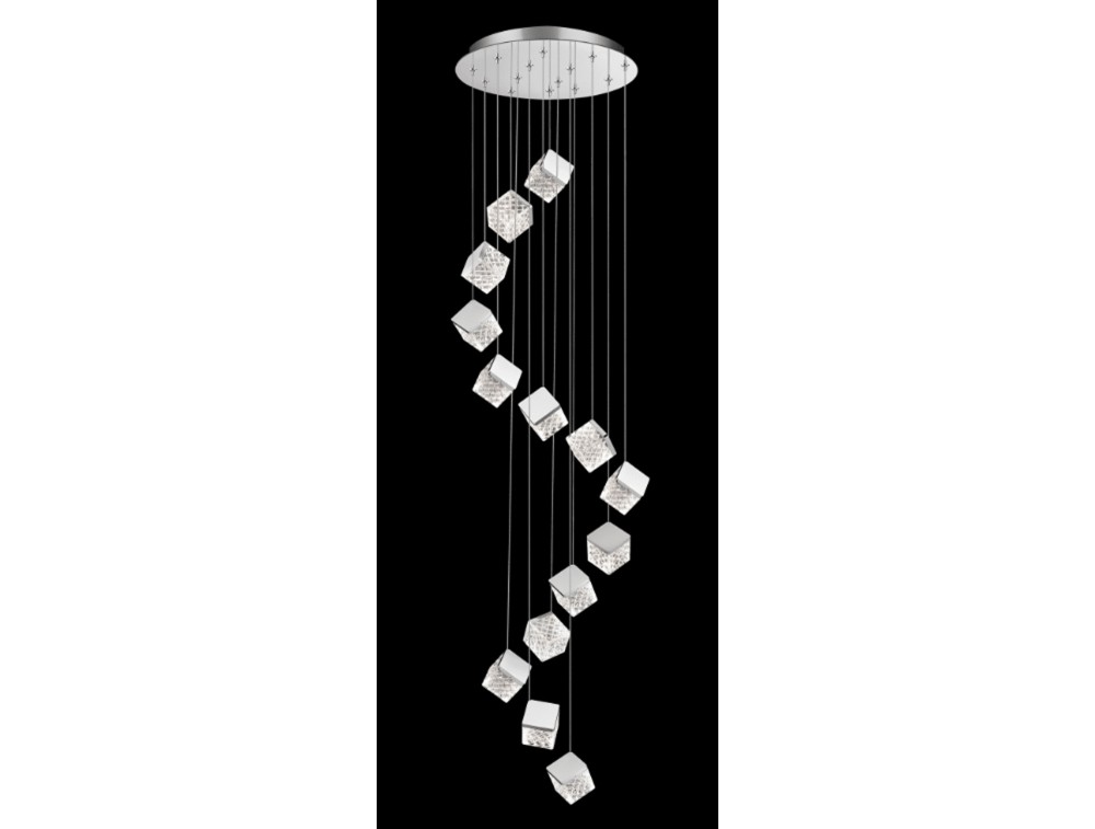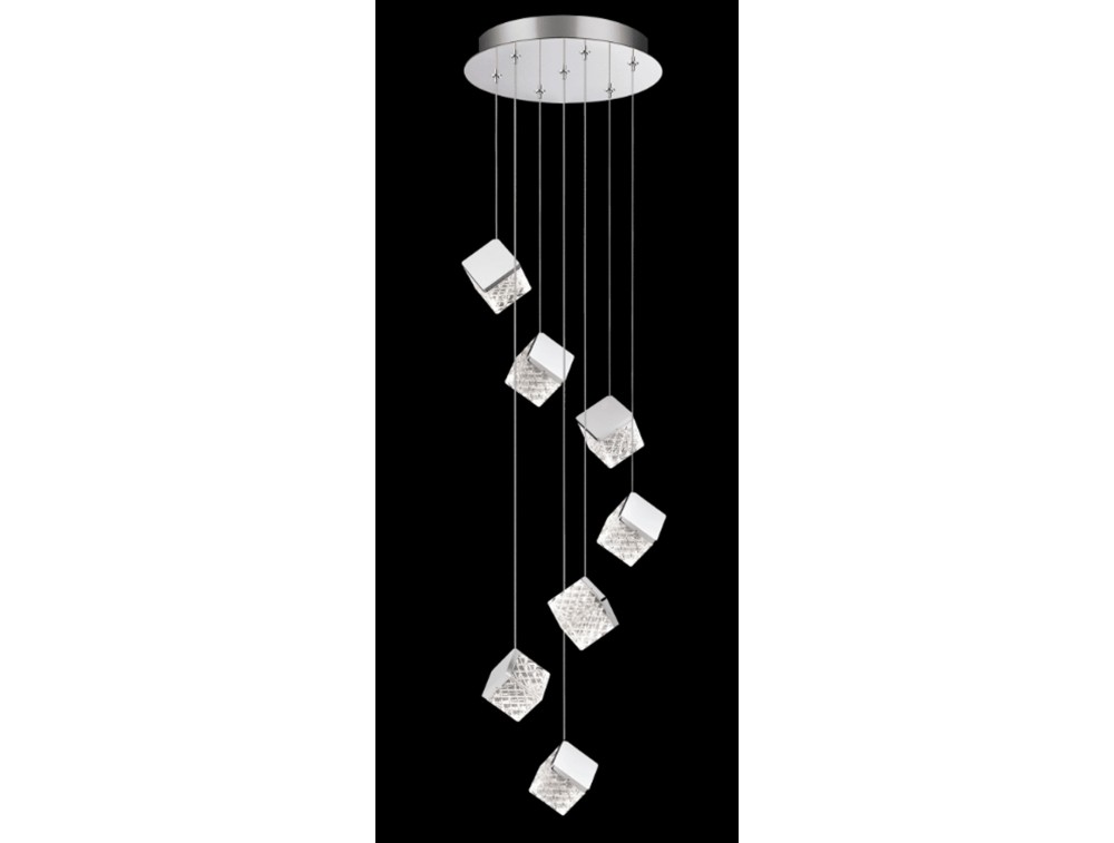 Sospensione con rosone circolare con 7, 14 o 20 lampade con pendente cubico. Disponibile con rosone nero satinato e pendente oro satinato oppure con rosone cromo lucido e pendente cromo lucido. Realizzata in metallo e con diffusore in acrilico. Tecnologia led integrata.