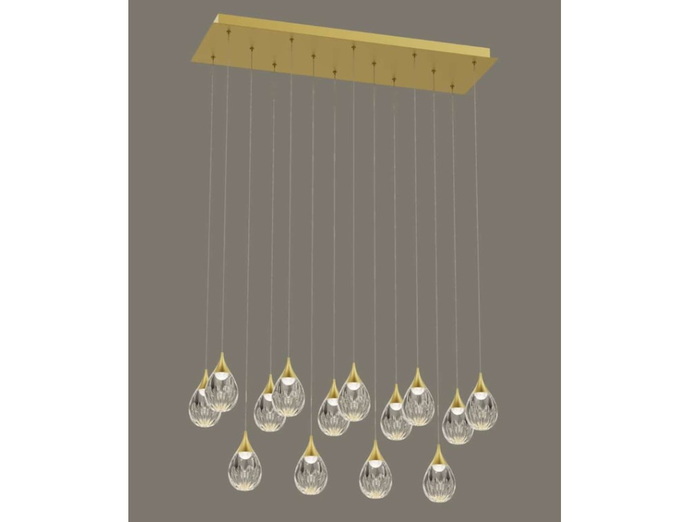Straordinaria sospensione rettangolare con 5 o 14 lampade, disponibile in finitura oro satinato e cromo lucido, creando un effetto luminoso senza tempo ed elegante. Diffusori in acrilico e led 3000K. Realizzata in metallo e vetro lavorato.