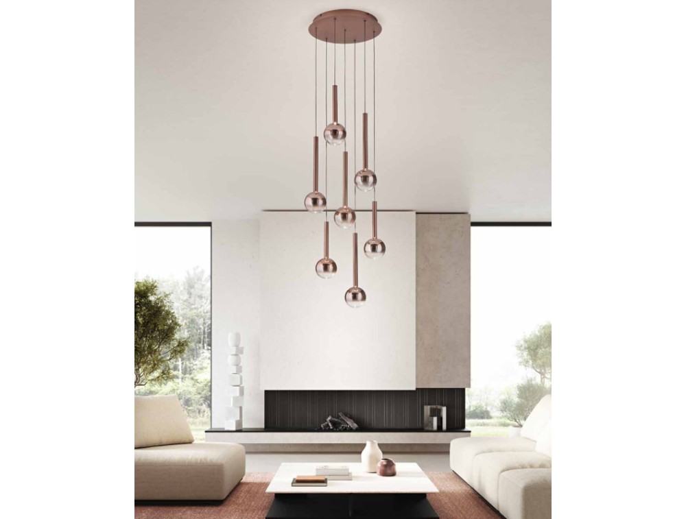 Sospensione led in metallo verniciato e vetro soffiato. Disponibile nella versione singola o multipla. Cavetti regolabili in lunghezza. Sospensione multipla dimmerabile. Perfetta per ingressi o saloni con soffitti molto alti, poiché riempie il vuoto visivo senza risultare pesante grazie alla trasparenza delle sfere. Ideale per arredare e illuminare cucina, salotto e camera da letto. Disponibile nelle finiture oro, marrone e nero con diffusori a forma di sfere sfumate.