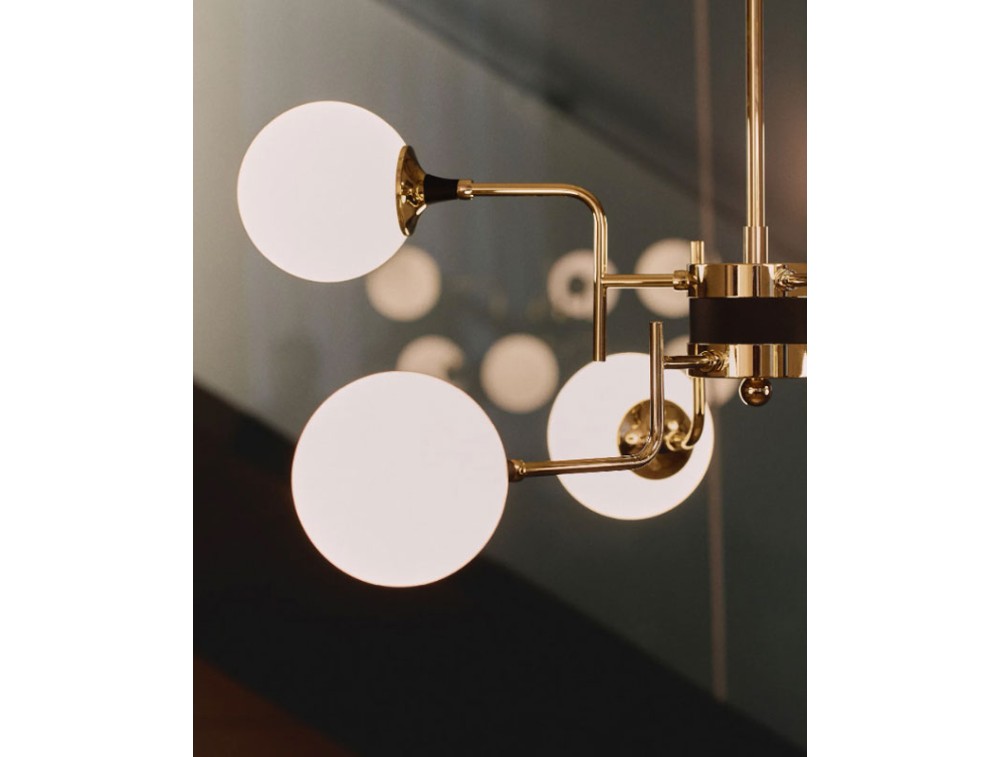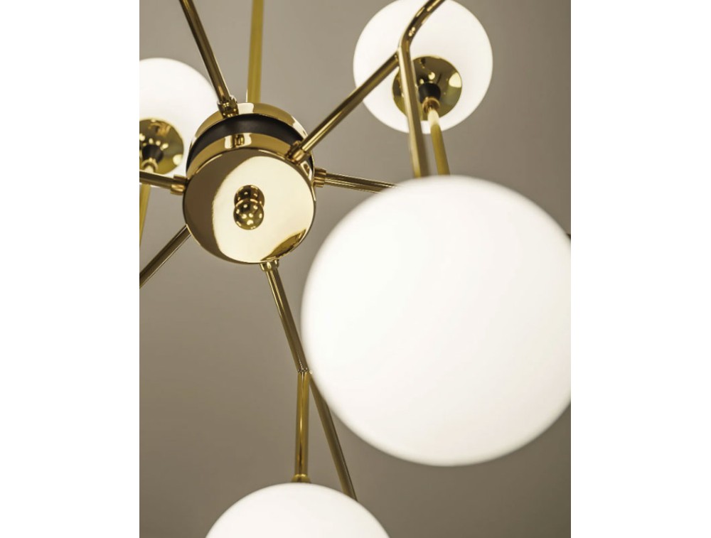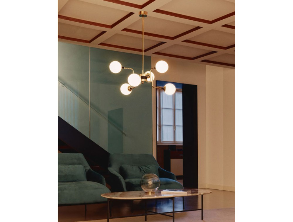 La qualità della luce è al centro del progetto Galassia. I diffusori in vetro soffiato triplex bianco garantiscono un’emissione luminosa morbida e uniforme, ideale per creare un’atmosfera accogliente e raffinata. La struttura sospesa, sostenuta da un’asta rigida intercambiabile in due misure, conferisce alla lampada una leggerezza visiva che amplifica la percezione dello spazio. Il design di Galassia si distingue per l’uso di materiali di pregio e finiture esclusive. L’ottone con doratura galvanica, scelto per la struttura e il coprifilo, conferisce un tocco di lusso discreto, mentre il vetro triplex bianco lavorato artigianalmente aggiunge profondità alla luce diffusa. Un’interpretazione contemporanea di un’estetica senza tempo. Galassia riprende il linguaggio formale delle grandi icone dell’illuminazione di metà Novecento, reinterpretandolo attraverso soluzioni tecnologiche moderne. Il sistema led integrato garantisce efficienza e comfort visivo, mantenendo il fascino della luce calda delle sorgenti tradizionali.