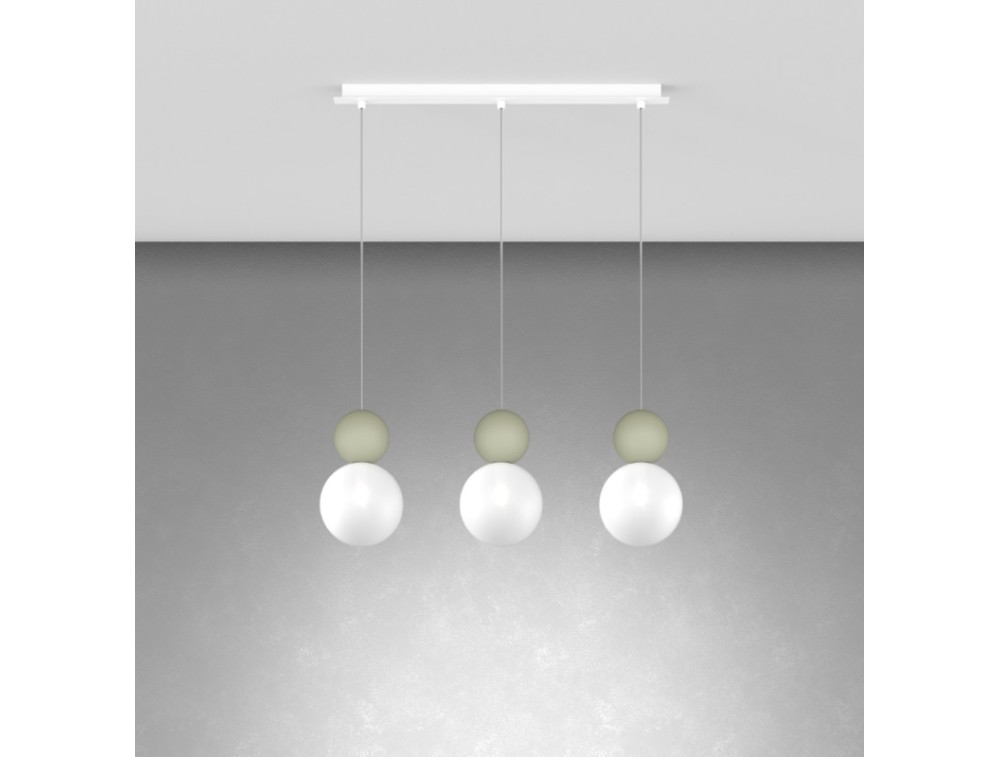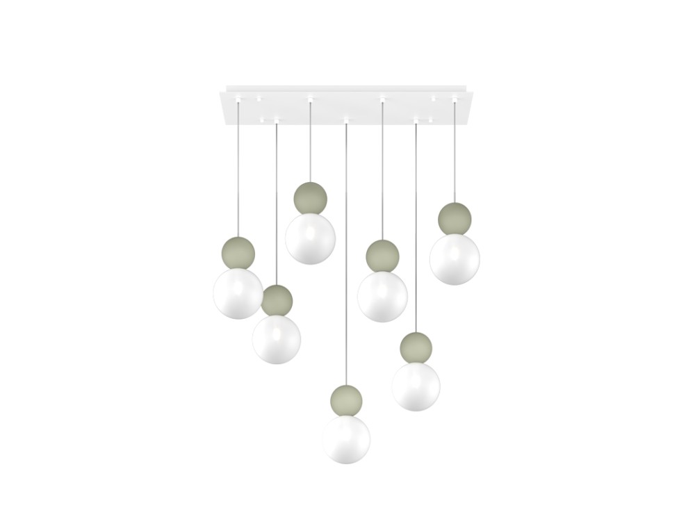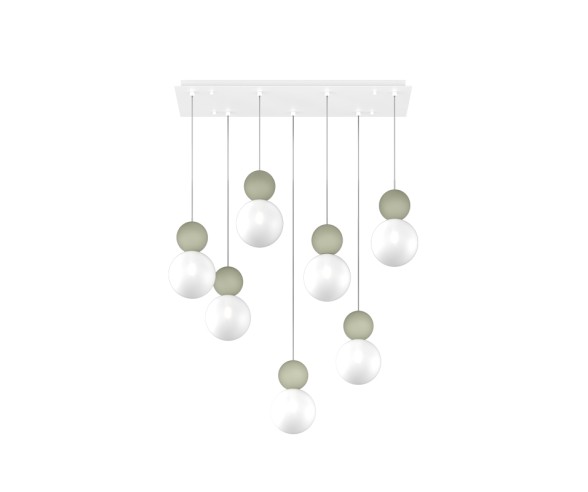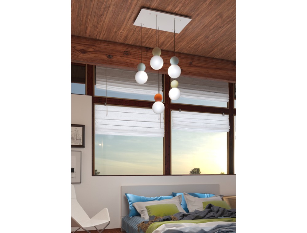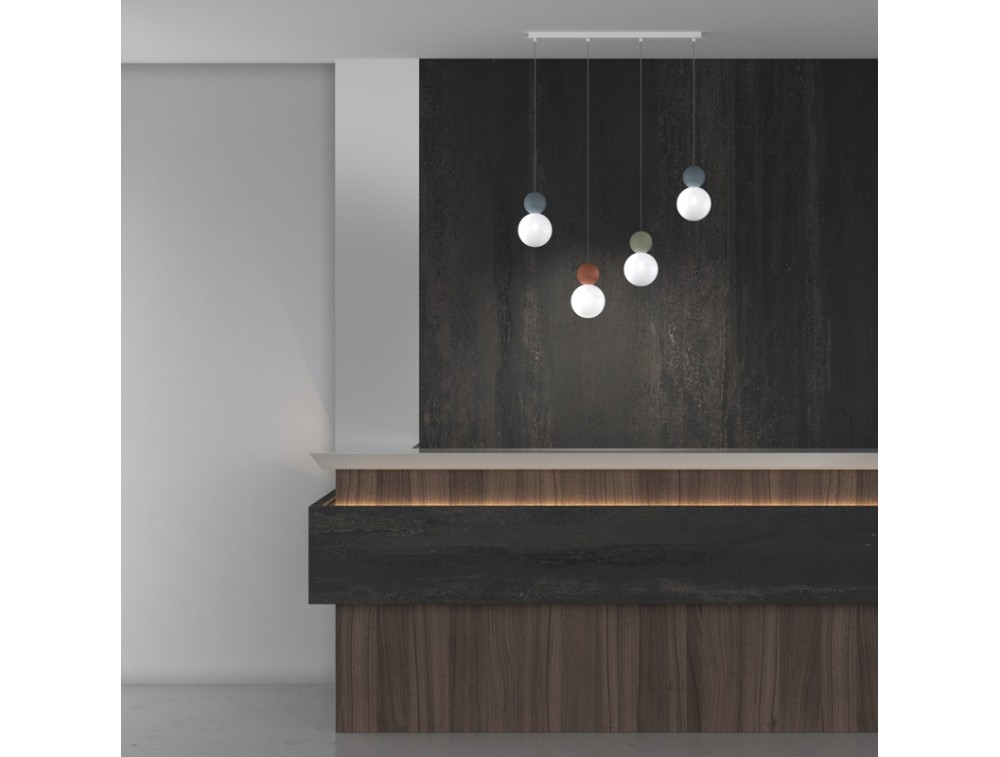 Sospensione regolabile in altezza, composta da 3, 4, 5 o 7 sfere in vetro pirex satinato sulle quali sono sovrapposte delle sfere in metallo verniciato in diverse finiture. Le sfere in metallo disponibili nelle finiture blu, verde e terra rossa hanno una tonalità omogenea ed opaca. La sfera in vetro può alloggiare lampadine G9 fino ad 8W di potenza che permettono al prodotto di essere molto luminoso. Per cucina, salotto e camera da letto. La versione