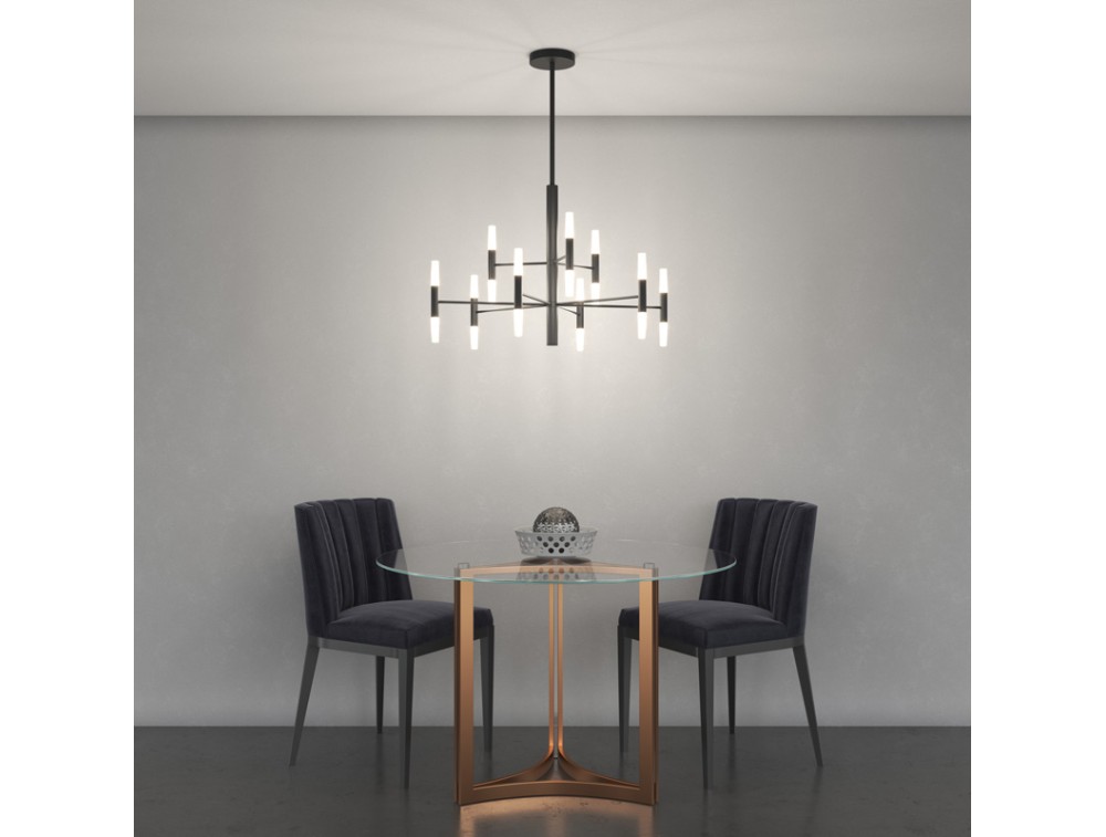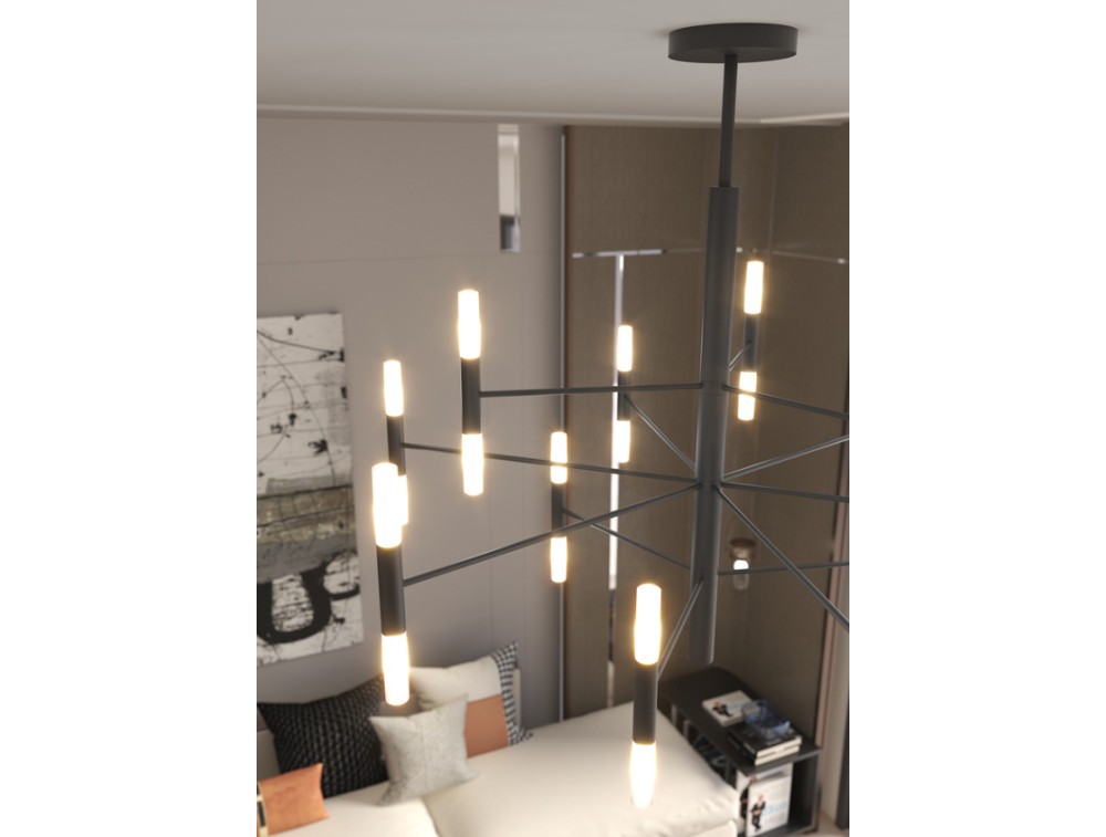 Sospensione composta da strutture in metallo verniciato nero o sabbia. I diffusori cilindrici in acrilico satinato, facilmente smontabili per effettuare la sostituzione della lampadina, diffondono uniformemente la luce nell’ambiente. I lampadari possono essere regolati in altezza mediante l’utilizzo di due distanziali forniti in dotazione. Per cucina, salotto e camera da letto.