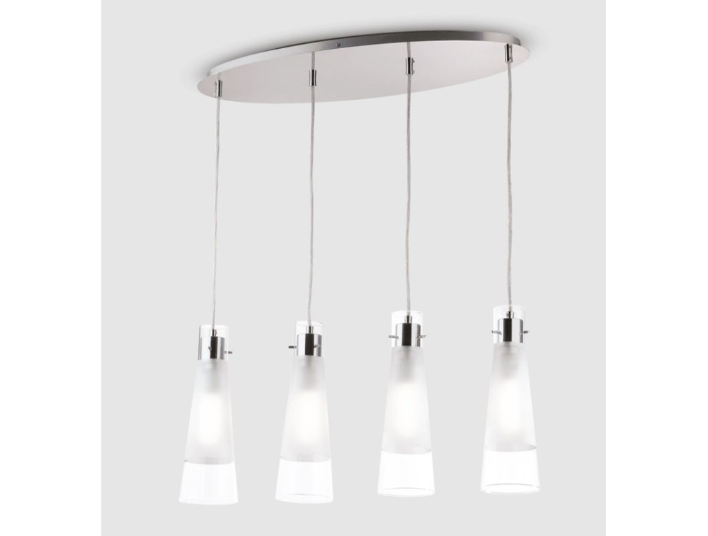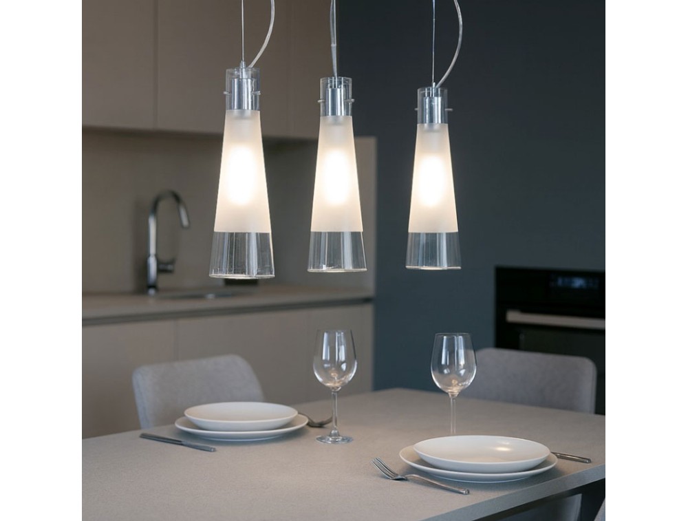 Struttura in metallo cromato con diffusori a cono in vetro sabbiato, che aggiungono un tocco sofisticato. Ogni diffusore è dotato di un attacco E27, che permette di personalizzare la luminosità con lampadine LED a scelta. Altezza regolabile. Ideale per cucina, salotto e camera da letto.