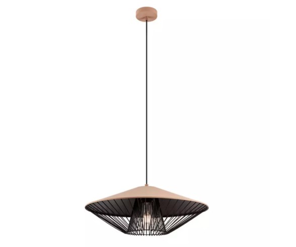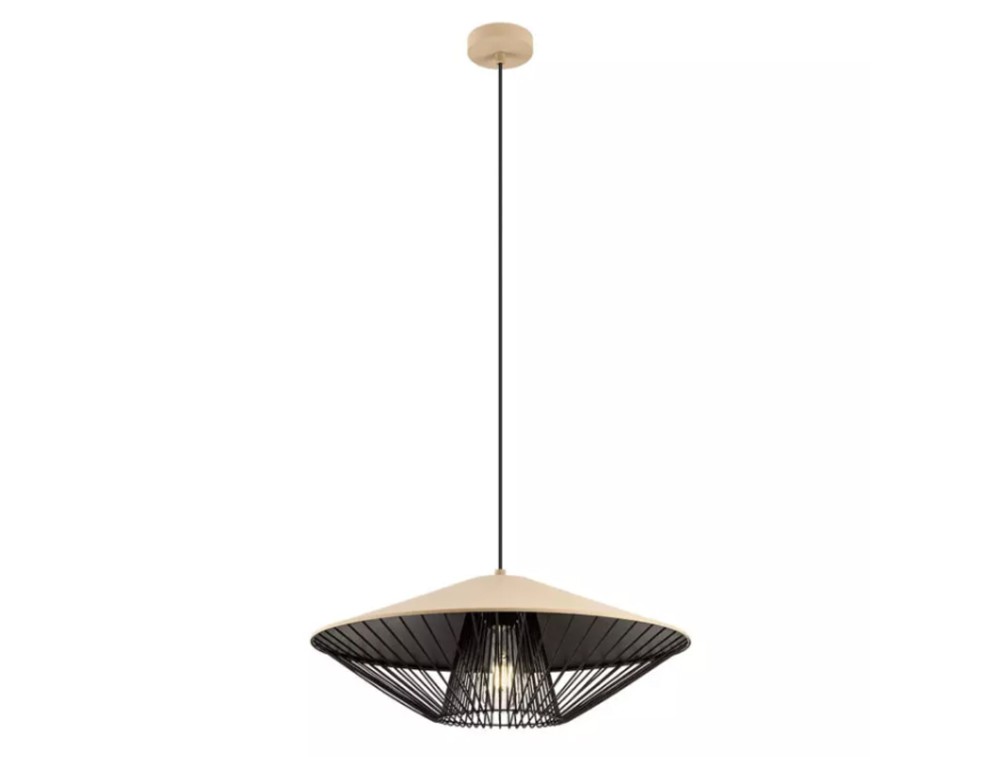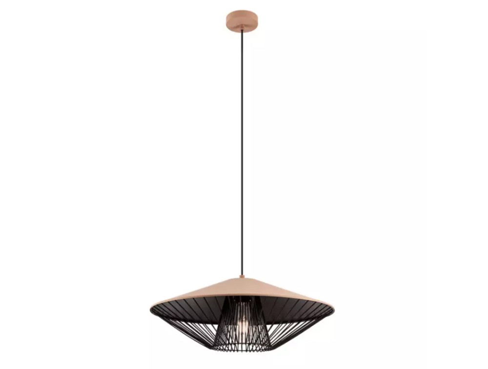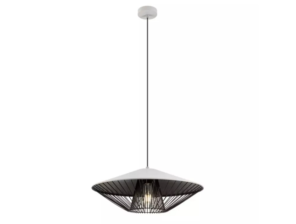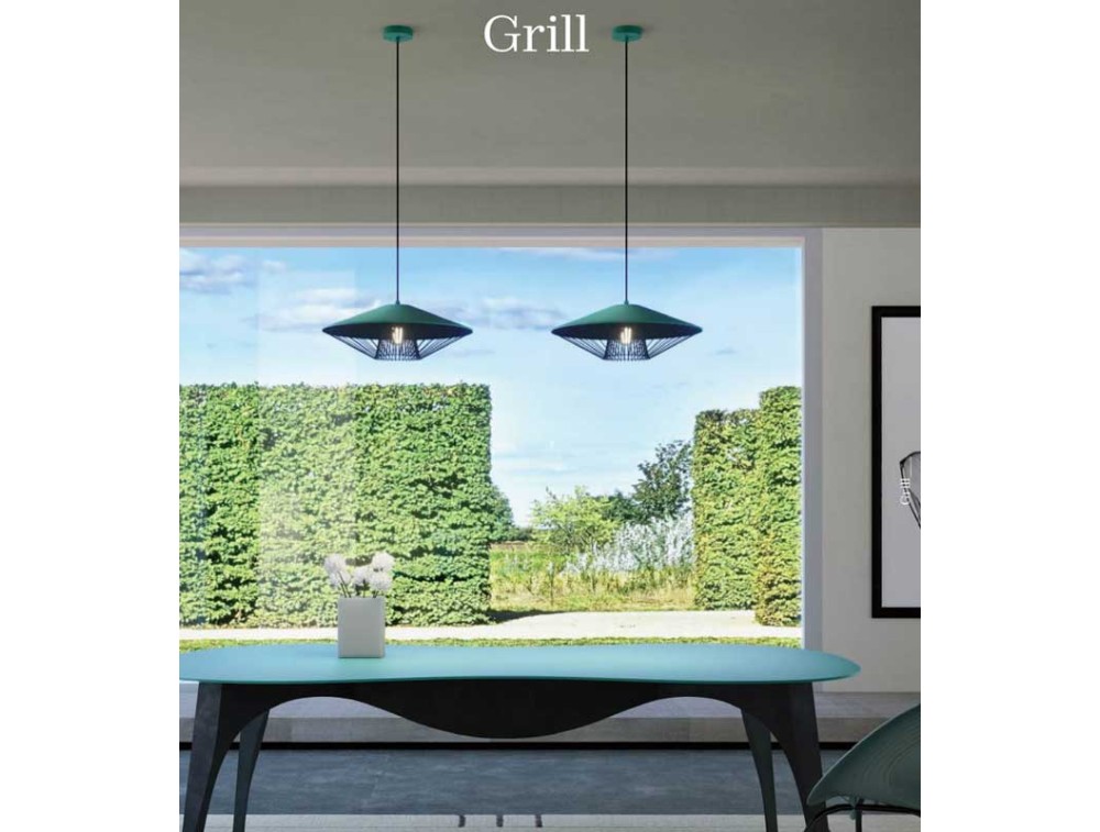 Sospensione per cucina, salotto e camera da letto, strutturata in metallo verniciato a polveri nero opaco, paralume in alluminio verniciato bianco opaco, marrone opaco, verde opaco o beige opaco esternamente e nero opaco internamente, griglia decorativa in metallo verniciata nero opaco.