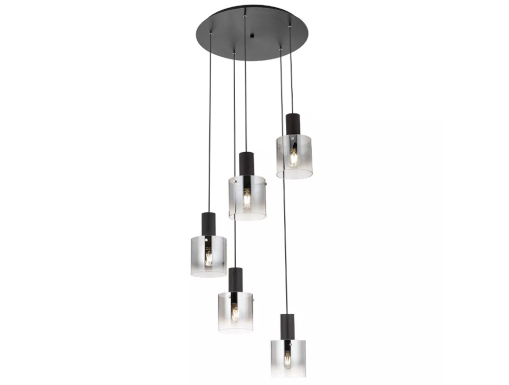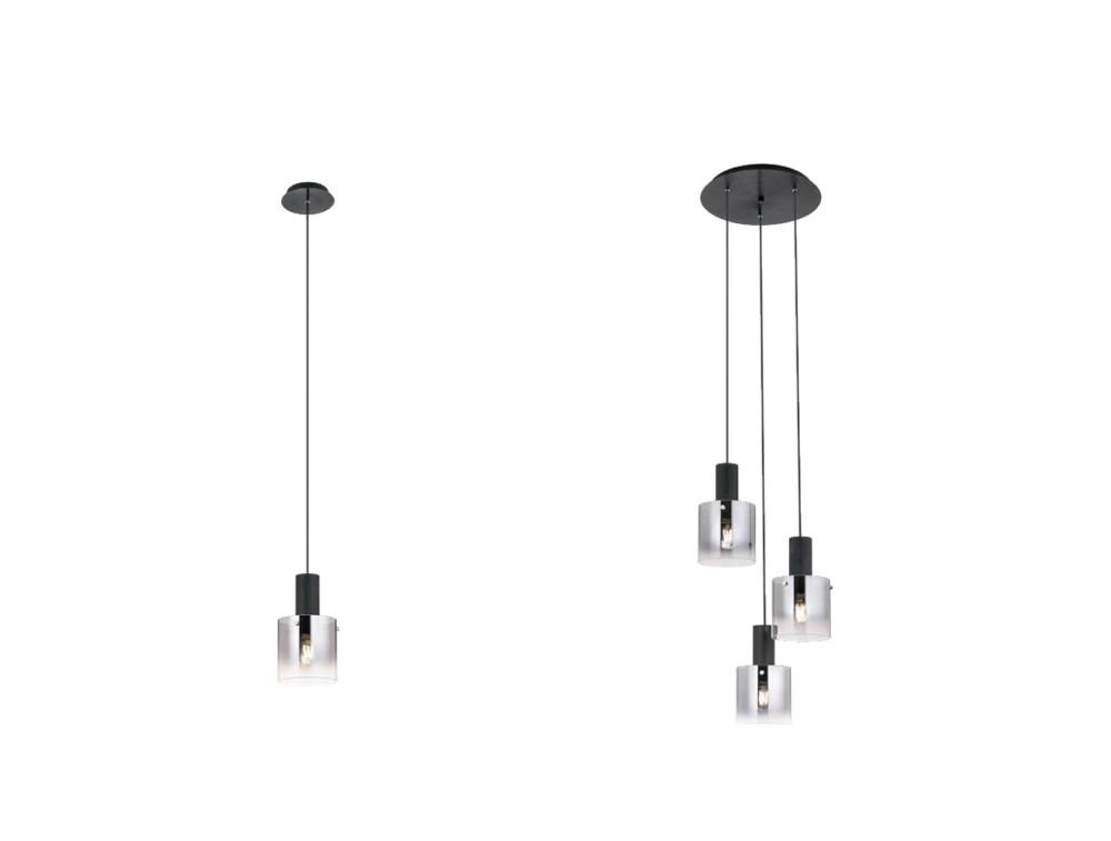 Un elemento cilindrico interno di colore nero opaco, che si connette al cavo di sospensione e contiene il portalampada o la fonte luminosa. Un diffusore esterno in vetro trasparente o leggermente satinato, a forma di cilindro aperto alla base. Questo diffusore racchiude l'elemento interno nero e la lampadina. La spedizione è gratuita e la garanzia di 2 anni.