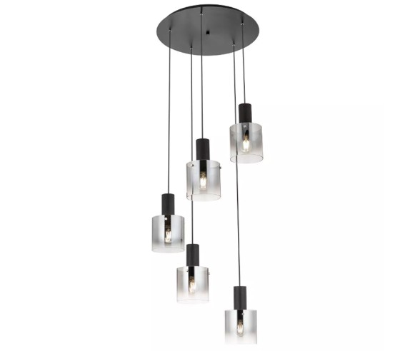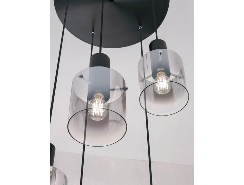 Sospensione per salotto, cucina e camera da letto, strutturata in metallo e alluminio anodizzato nero, diffusori in vetro sfumato fumè
