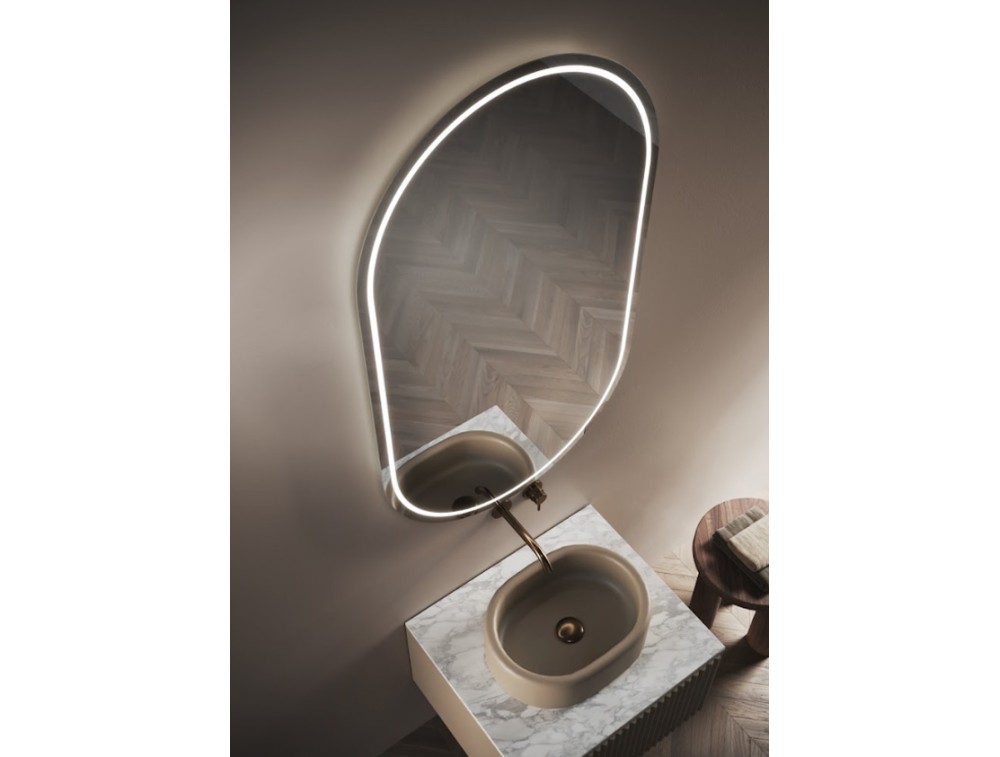 Specchio sagomato con sabbiatura interna mm.10 retroilluminata led. Spessore specchio 4mm. Protezione IP44. Disponibile anche la versione "Modus" senza illuminazione e "Modus Ambient" con retroilluminazione led.