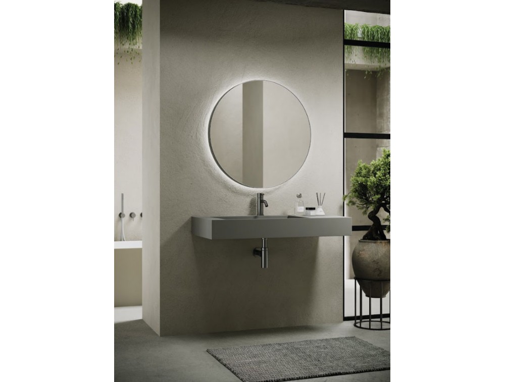 Specchio con cornice perimetrale in metallo rotonda e retroilluminazione a led. Disponibile in diverse misure e finiture. Disponibile versione "Zen Light A/Light B" con sabbiatura interna e led o nella versione "Zen" senza alcun led integrato.