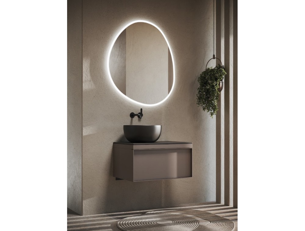 Specchio sagomato con sabbiatura perimetrale mm.18 retroilluminata led. Disponibile in diverse finiture. Illuminazione a luce diretta con sistema “diffusion”. Protezione IP44.