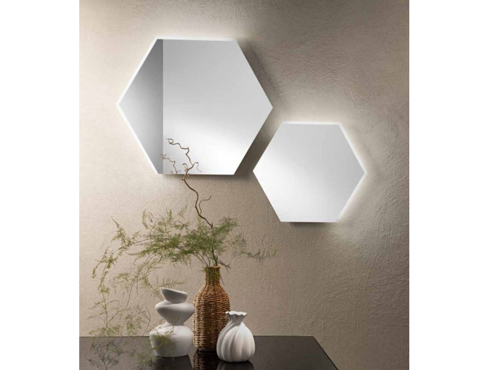 Specchio esagonale con bordo LED satinato su tre lati per un effetto moderno ed elegante. Due dimensioni, due temperature e doppio fissaggio, per un ulteriore tocco di personalizzazione. Durata sorgente luminosa 30.000 ore. Struttura pvc pellicola antideflagrante. Presenta un'estetica moderna e sofisticata, caratterizzata da linee pulite e un uso scenografico della luce.