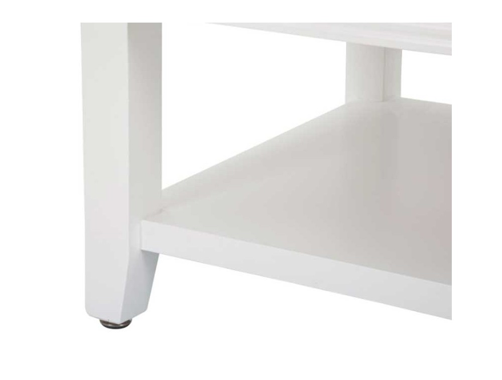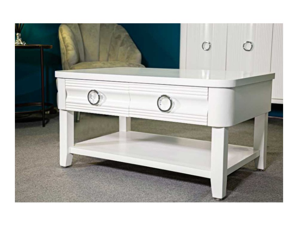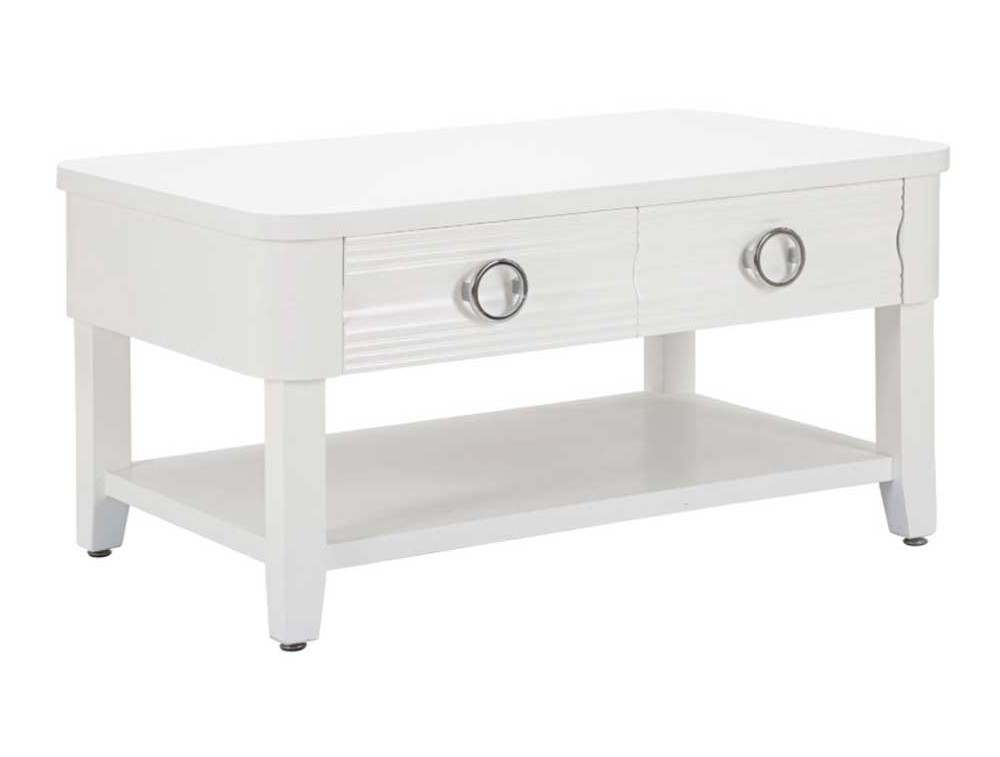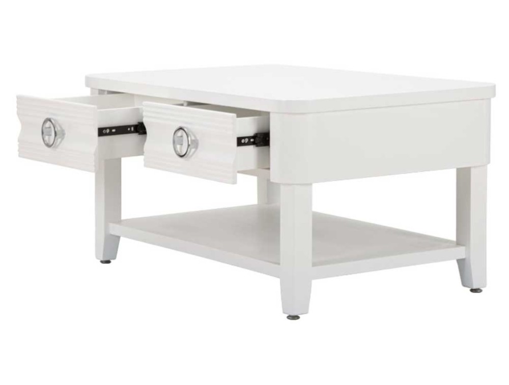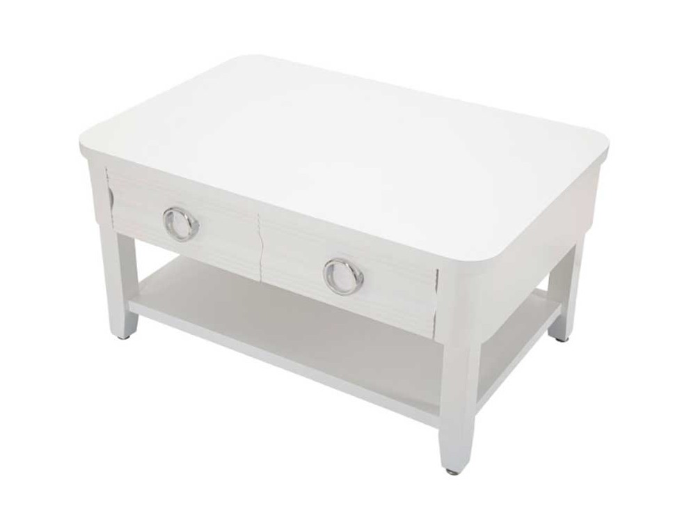 Tavolo da caffè in legno bianco rettangolare con 2 cassetti e ripiano dalla lavorazione semplice e dalle linee essenziali. Realizzato in legno di abete, pannello di fibra a media densità e metallo.