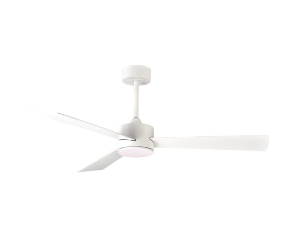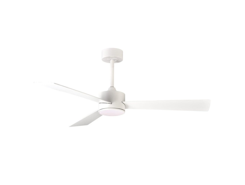 Ventilatore con pale reversibili. Lampada ventilatore silenziosa pensata per soggiorni e cucine. Colore bianco con tre pale reversibili in bianco o effetto legno di faggio. Telecomando* per controllare le funzionalità del ventilatore e dell'illuminazione. Include due montanti di installazione ed è adatto per soffitti inclinati.