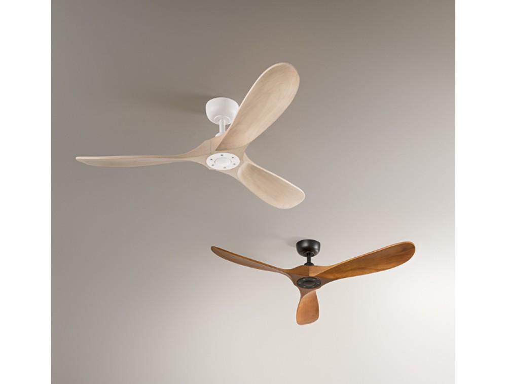 Ventilatore con struttura in metallo verniciato a polvere. 3 pale in legno verniciato. No kit luce. Telecomando per led e per regolare la velocità del ventilatore (5 velocità). In camera da letto, se hai spazio, il movimento lento delle pale in legno crea un effetto ipnotico e rilassante che concilia il sonno. Per verande o porticati, il richiamo al legno lo rende ideale per ambienti che fanno da ponte tra interno ed esterno. Questo ventilatore non è solo uno strumento per fare aria, è una dichiarazione di stile. Se i modelli a scomparsa servono a "nascondere" la funzione, questo serve a "esibirla" con eleganza.