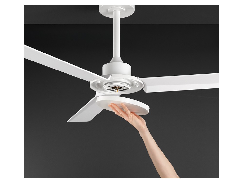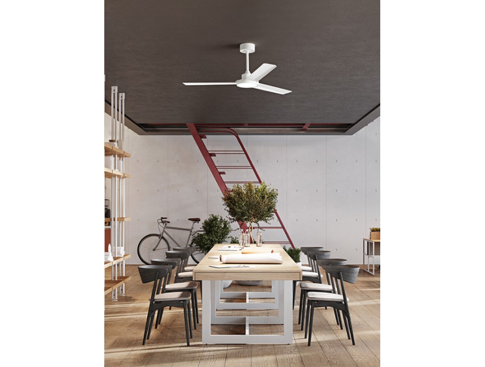 Ventilatore con 3 pale in ABS colore bianco e diffusore in acrilico satinato. Struttura in metallo verniciato a polvere bianco. Kit luce removibile con tappo di chiusura incluso. Telecomando per led e per regolare la velocità del ventilatore (6 velocità). Le pale lunghe e piatte sono progettate per muovere una colonna d'aria ampia e costante, rendendolo ideale per rinfrescare stanze di dimensioni medio-grandi.