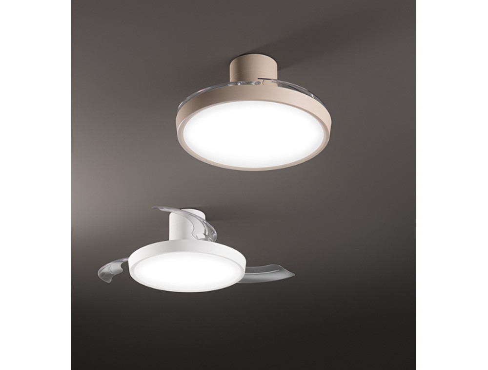 Ventilatore con 3 pale a scomparsa in acrilico trasparente e diffusore in acrilico satinato. Telecomando per led e per regolare la velocità del ventilatore (6 velocità). Struttura in metallo verniciato a polvere bianco o sabbia opaco. Il design moderno riesca a nascondere la funzionalità dietro un'estetica pulita. Una soluzione perfetta per chi non ama l'ingombro visivo dei ventilatori tradizionali. Quando le pale sono chiuse, hai una plafoniera discreta; quando sono aperte, le pale in acrilico sono molto silenziose. La luce LED soffusa è ideale per creare un'atmosfera rilassante.
