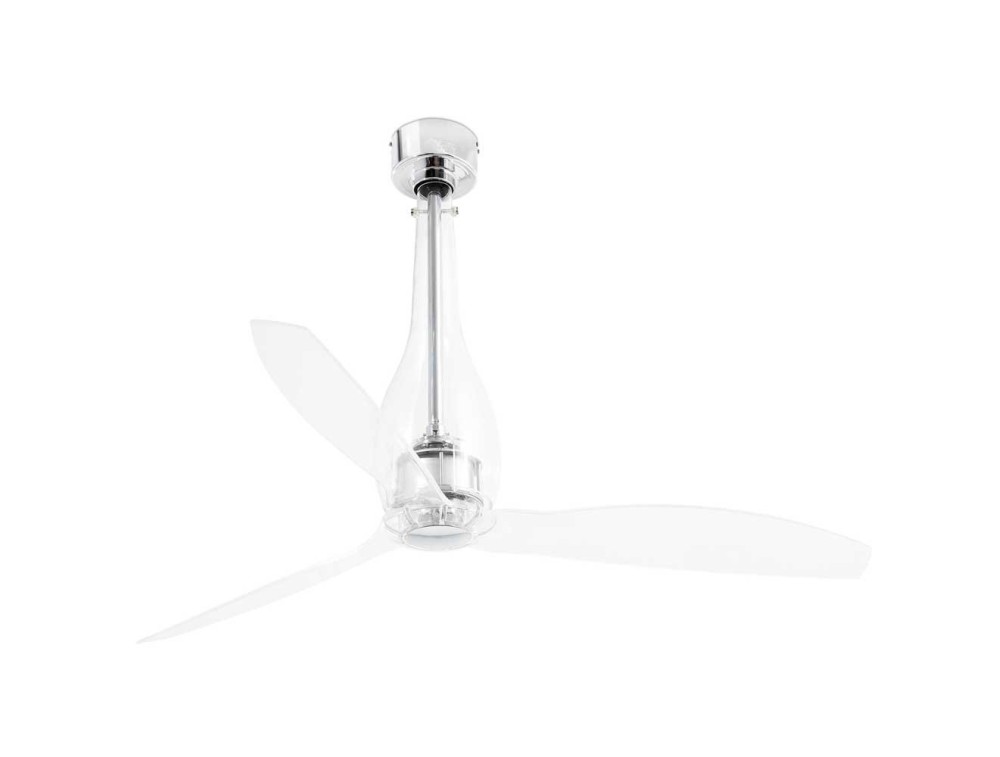 Ventilatore da soffitto con motore DC in metallo e vetro cromo e pale trasparenti in policarbonato. 6 velocità regolabili con telecomando incluso, funzione inversa.