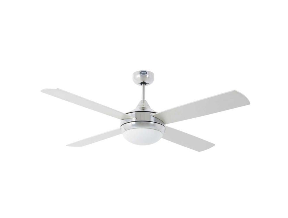 Ventilatore da soffitto con quattro pale reversibili alluminio e grigio acero, struttura in acciaio e diffusore in vetro opale. Adatto per soffitto inclinato, telecomando incluso.