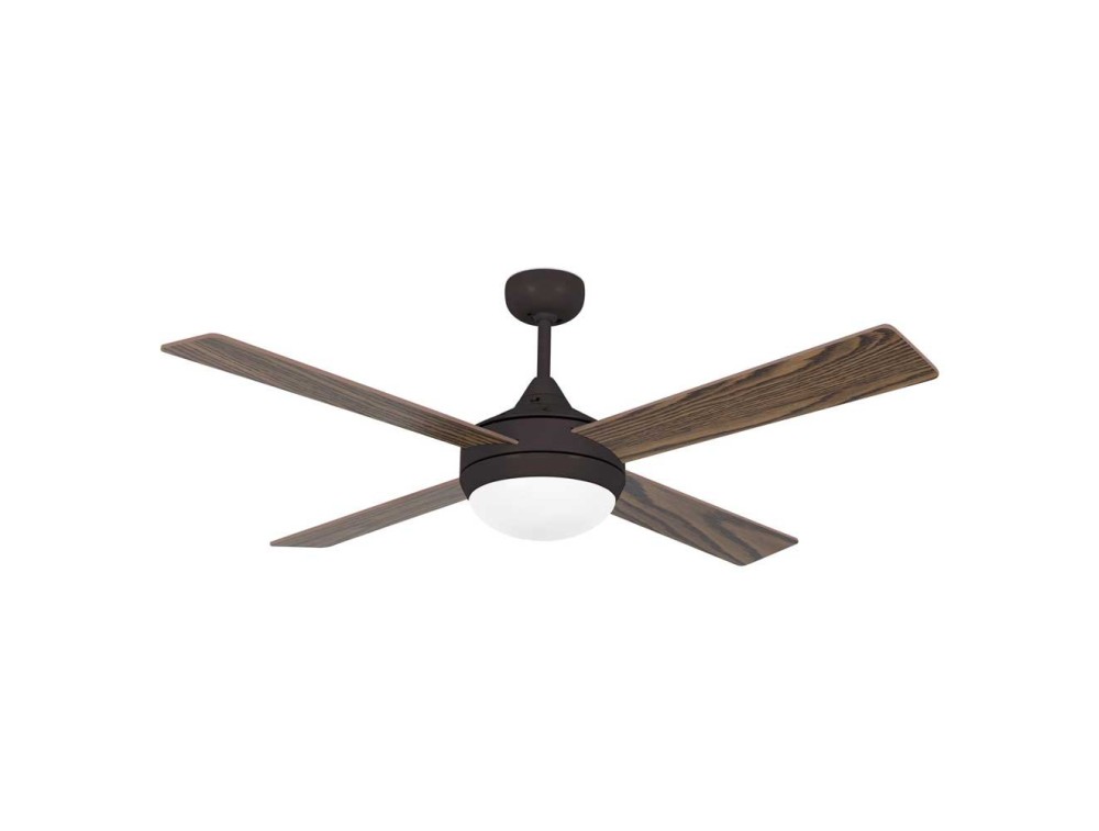 Ventilatore da soffitto con quattro pale reversibili marrone e mogano, struttura in acciaio e diffusore in vetro opale. Adatto per soffitto inclinato, telecomando incluso.