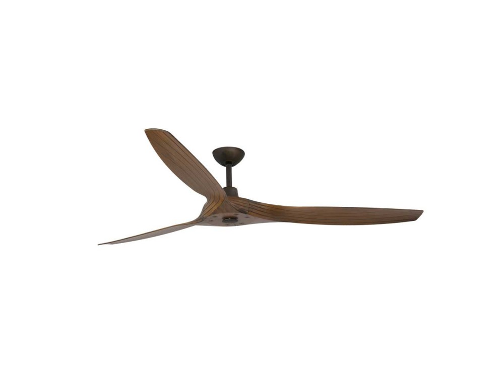 Ventilatore da soffitto realizzato con motore DC in acciaio marrone e pale in legno ABS. Funziona con telecomando, incluso. Ha 5 velocità regolabili, adatto per soffitti inclinati.