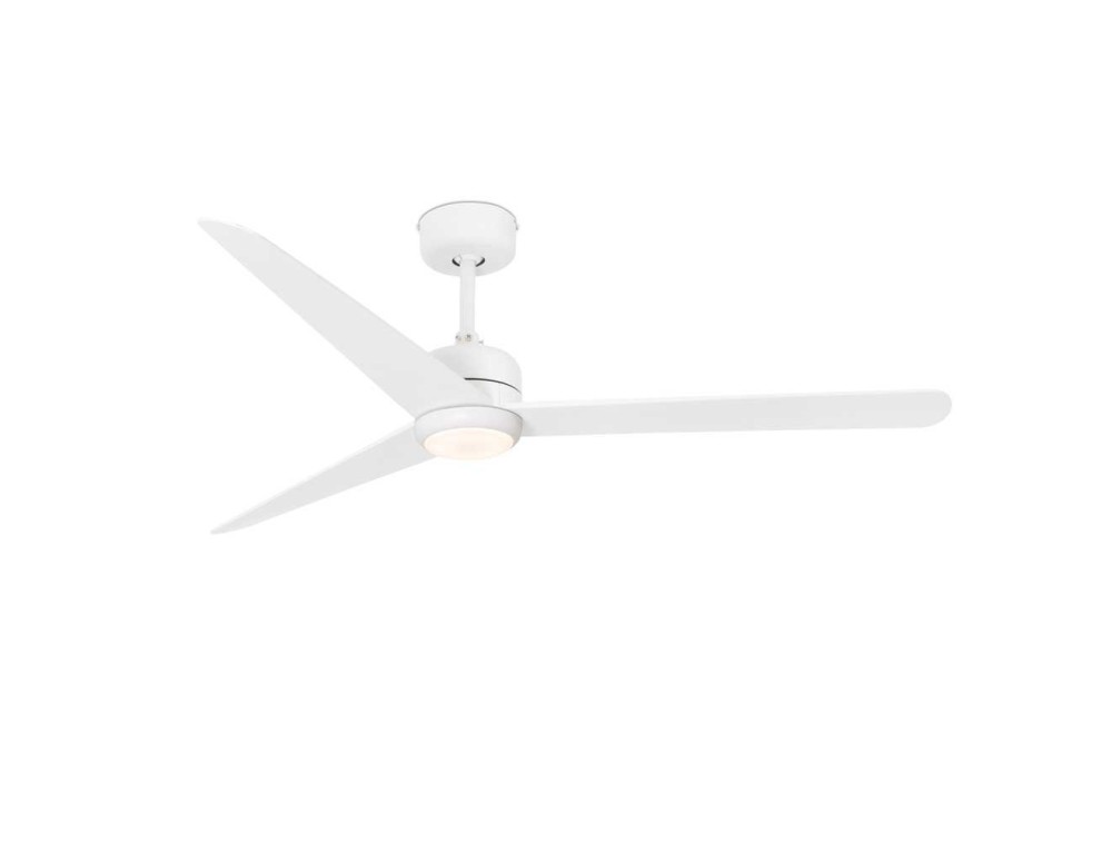 Ventilatore da soffitto LED realizzato con motore DC in acciaio e pale in ABS bianco. Si aziona con telecomando, incluso. 6 velocità regolabili, funzione inversa,, adatto per soffitto inclinato.