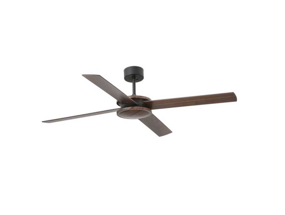 Ventilatore da soffitto realizzato con motore DC in acciaio e pale in legno marrone e nero. 6 velocità regolabili con telecomando incluso. Funzione inversa, adatto per soffitto inclinato.